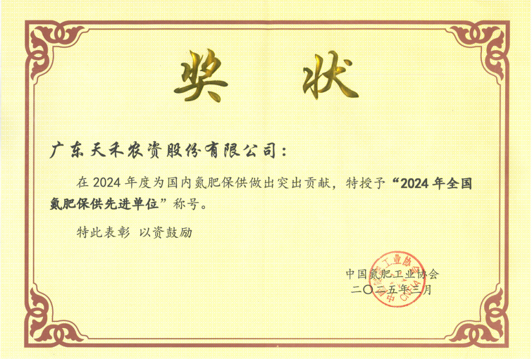 3月5日至7日,由中国氮肥工业协会主办的“2025年全国春季氮肥市场形势分析会”在浙江杭州召开。本次会议旨在共同探讨氮肥市场的最新趋势和发展机遇,共谋春耕保供大计,为粮食生产的稳定与发展提供有力支撑。会议表彰环节中,天禾股份凭借在氮肥保供方面的积极贡献,获评“2024年全国氮肥保供先进单位”称号。