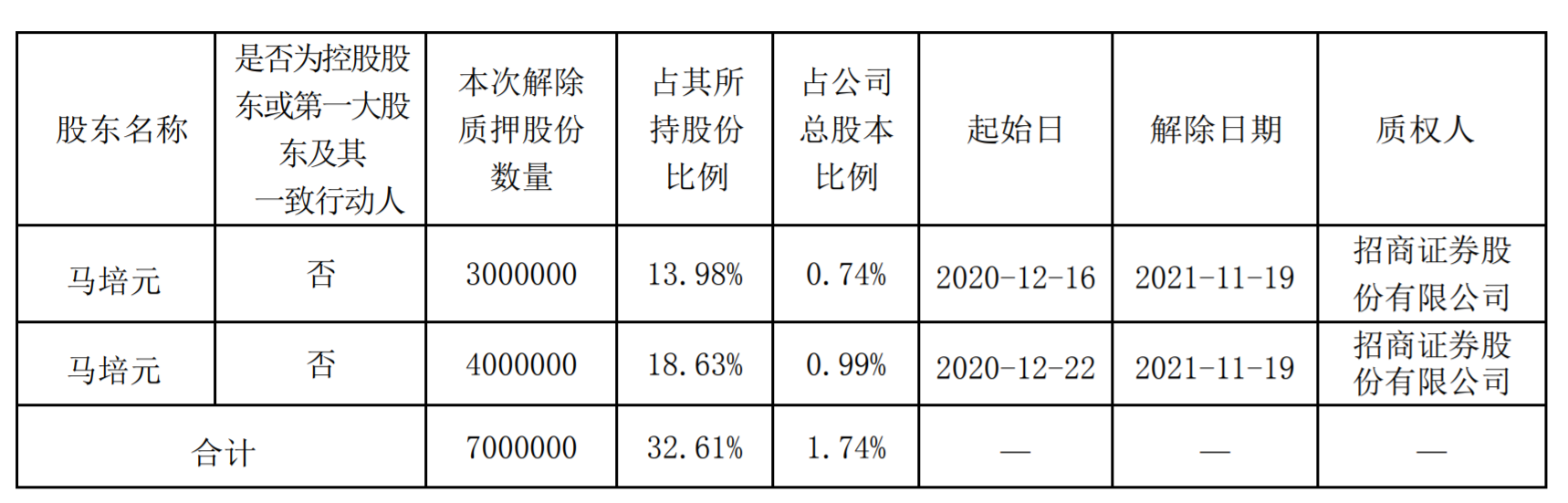 公告显示,劲仔食品于近日收到了公司持股5%以上股东马培元的通知,马培元将其所持有的公司700万股股份办理了解除质押手续,占劲仔食品总股本比例为1.74%。