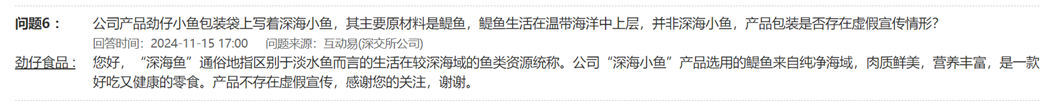 针对上述质疑,劲仔食品方面并未给出明确回应。有劲仔食品工作人员在平台上回复称,“深海鱼”通俗地指区别于淡水鱼而言的生活在较深海域的鱼类资源统称。公司“深海小鱼”产品选用的鳀鱼来自纯净海域,肉质鲜美,营养丰富,是一款好吃又健康的零食。产品不存在虚假宣传。