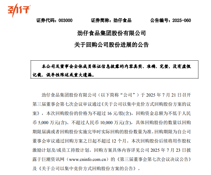 9月3日,劲仔食品(003000.SZ)发布公告,披露了其以集中竞价方式回购股份的最新进展。公告显示,截至2025年9 月3日,公司已通过集中竞价交易累计回购股份560万股,占总股本的1.2420%,成交金额达 6957.56 万元(不含交易费用),回购价格区间为 12.25 元/股至12.70元/股。