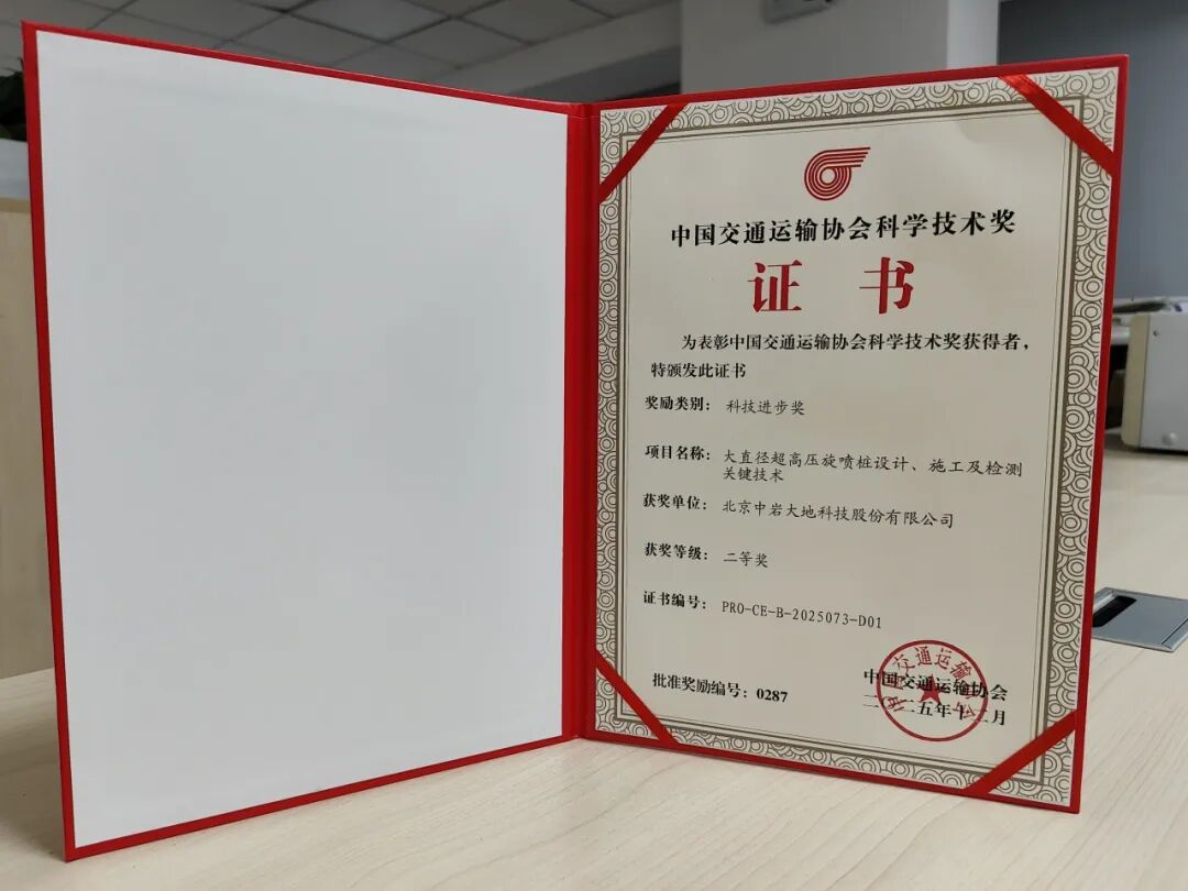 近日,2025年度中国交通运输协会科学技术进步奖评选结果揭晓,北京中岩大地科技股份有限公司(以下简称“中岩大地”)依托核心工艺SJT超级旋喷技术和张靖皋长江大桥锚锭地基处理项目,以第一完成单位申报的《大直径超高压旋喷桩设计、施工及检测关键技术》项目,荣获科技进步奖二等奖。