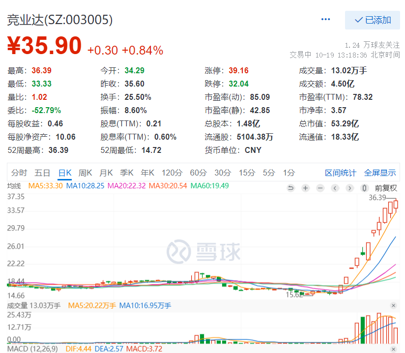 经历了早期的上涨后,竞业达股价一路下滑。今年4月,其股价一度跌到14.72元,较发行价31.83元已然腰斩。但9月以来,竞业达股价突然大涨。两个月间从16.3元暴涨至如今的35.6元,涨幅达118%。