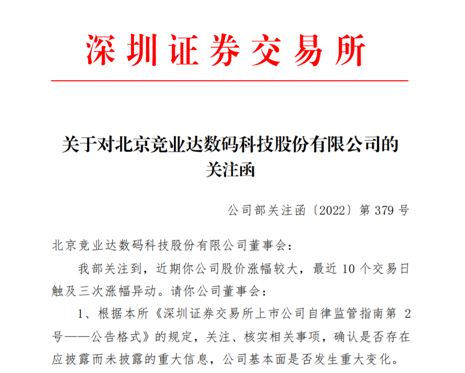 深交所指出,竞业达公司股价涨幅较大,最近10个交易日触及三次涨幅异动。对此,深交所要求竞业达就5项问题做出回应。其中包括是否存在应披露而未披露的重大信息,公司基本面是否发生重大变化;说明股东及实际控制人是否计划对公司进行股权转让、资产重组以及其他对公司有重大影响的事项。