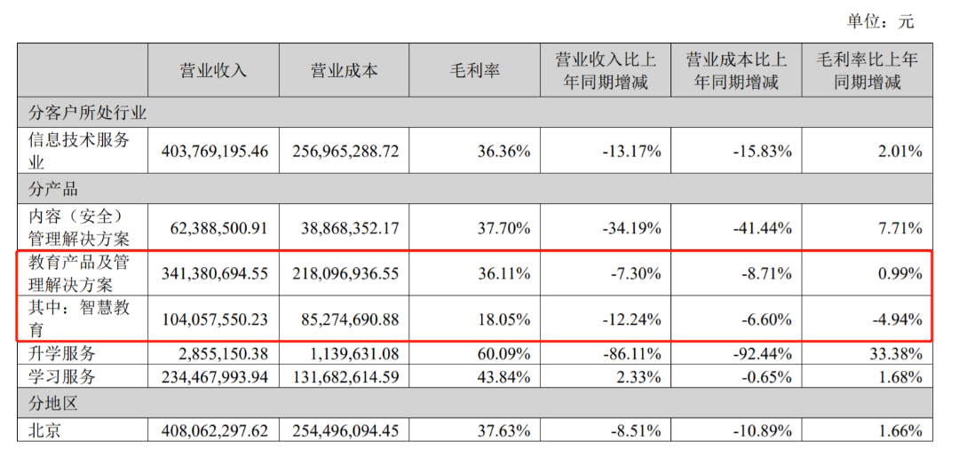 但实际上,对比拥有教育信息化业务的其他公司看,即便受到冲击,也没有如此明显的业绩下滑。比如,佳发教育的标准化考点设备同比增长了28.01%;智慧教育产品及整体解决方案收入虽然有所下滑,但仅下滑2.69%。