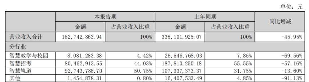 今年上半年,竞业达实现营收1.83亿元,同比大幅下滑45.95%。值得注意的是,拖累业绩的并不是智慧轨道业务,而是营收的主要来源——教育信息化业务。上半年竞业达的智慧教学与校园业务收入808.1万元,去年同期则为2654.7万元,同比大幅下滑69.56%。智慧招考业务营收8046.3万元,去年同期为1.88亿元,同比大幅下滑57.16%。显然,竞业达的教育信息化业务的表现难言理想。