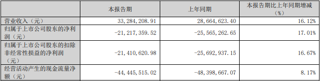2025年一季度,公司实现营业收入3328.42万元,同比增长16.12%;归属于上市公司股东的净利润-2121.74万元,上年同期为-2556.53万元;归属于上市公司股东的扣除非经常性损益的净利润-2141.06万元,上年同期为-2569.29万元;经营活动产生的现金流量净额-4444.55万元,上年同期为-4839.87万元。