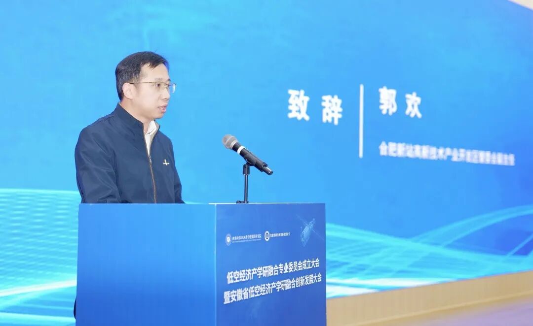 来自合肥新站高新区管委会、北航合肥创新研究院、国际先进技术应用推进中心(合肥)及竞业达的领导嘉宾席大会并分别致辞。作为本次大会的承办方及专委会重要发起单位,竞业达董事长钱瑞在致辞中指出,低空经济作为国家“十五五”规划明确的战略性新兴产业,是培育新质生产力的重要引擎;安徽凭借深厚的产业积淀与前瞻的政策体系,正成为全国低空经济发展的重要支点。竞业达深耕智慧教育领域二十八载,在低空赛道已完成完善布局,依托竞业达怀来教育科技产业园,已建成了京北最大的无人机飞行训练场,构建了涵盖低空经济人才培养的完备体系。他表示,竞业达将践行“双核联动、多点支撑”战略的关键落子,以安徽为枢纽,辐射带动全国低空经济产业的协同发展。