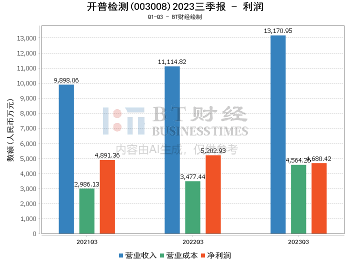 企业的利润表现方面,2023年初至三季度末,开普检测实现营业收入1.32亿元,同比增长18.50%,营业利润为5305.43万元,虽然较上年同期的6056.16万元有所下降,但仍保持了一定的盈利水平。营业成本的增长较为显著,从上年同期的3477.44万元增加至4564.26万元,增长率达到31.25%,主要是由于新增华南(珠海)基地的折旧摊销成本以及人工成本的增长。净利润为4680.42万元,同比减少了10.04%。