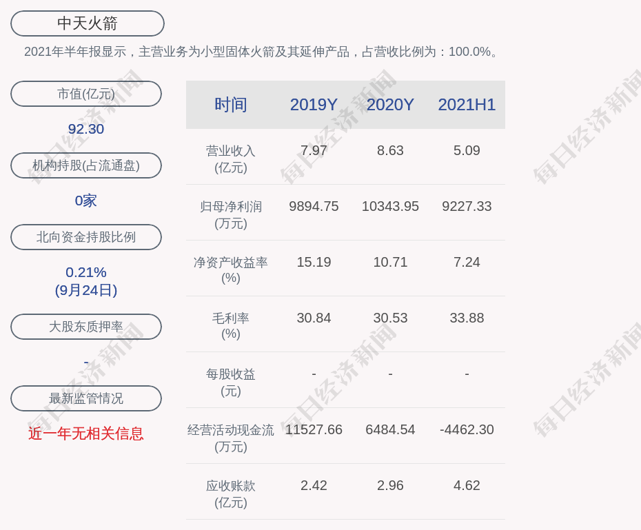 2021年半年报显示,中天火箭的主营业务为小型固体火箭及其延伸产品,占营收比例为:100.0%。
