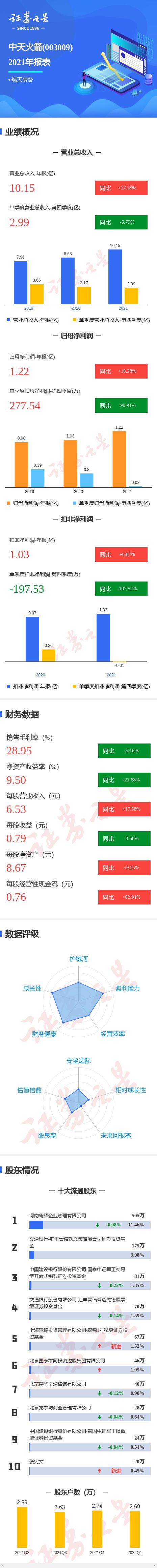 中天火箭2021年报显示,公司主营收入10.15亿元,同比上升17.58%;归母净利润1.22亿元,同比上升18.28%;扣非净利润1.04亿元,同比上升6.87%;其中2021年第四季度,公司单季度主营收入2.99亿元,同比下降5.79%;单季度归母净利润277.54万元,同比下降90.91%;单季度扣非净利润-197.53万元,同比下降107.52%;负债率27.83%,投资收益108.37万元,财务费用-283.95万元,毛利率28.95%。