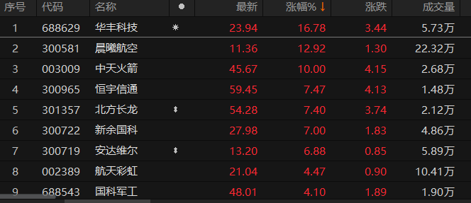 据金融终端数据,10月16日早盘,申万一级行业板块中,国防军工板块迅速拉升,中天火箭涨停,华丰科技涨超16%,晨曦航空涨超12%,恒宇信通、北方长龙等跟涨。