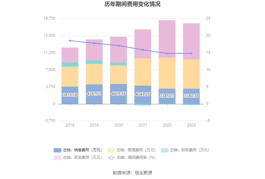 2023年,公司期间费用为1.75亿元,较上年同期减少825.45万元;期间费用率为14.82%,较上年同期持平。其中,销售费用同比下降0.14%,管理费用同比下降5.85%,研发费用同比下降3.65%,财务费用由去年同期的-104.19万元变为-227.11万元。
