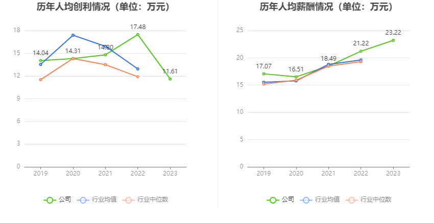 截至2023年末,公司员工总数为827人,人均创收142.70万元,人均创利11.61万元,人均薪酬23.22万元,较上年同期分别变化-4.73%、-33.59%、9.44%。