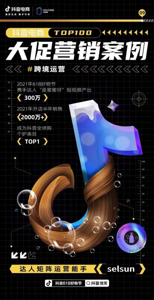 6月1日,抖音电商全面开启“抖音618好物节”,对于新入场抖音电商的品牌方来说,如何在这片新晋电商流量平台实现大促期间的业绩增长,带动新的销量?近期,抖音电商精选了包括selsun在内的TOP100大促营销案例,希望用优秀的成功案例为商家提供“前辈”经验,以玩转兴趣电商新模式、激发新生意。