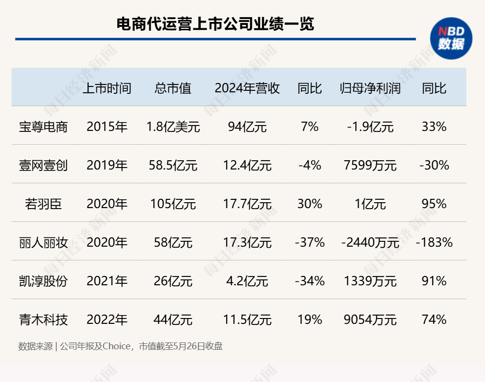 随着中国成为全球美妆行业第二大市场,以美妆业务为主的几家代运营公司先后上市,风头正劲,其股价、市值均处于历史高峰,宝尊电商(09991.HK,股价7.9港元,市值15亿港元)和丽人丽妆(605136.SH,股价14.9元,市值59.67亿元)市值均一度超过200亿元,而以代理母婴和保健品为主的若羽臣彼时显得默默无闻。