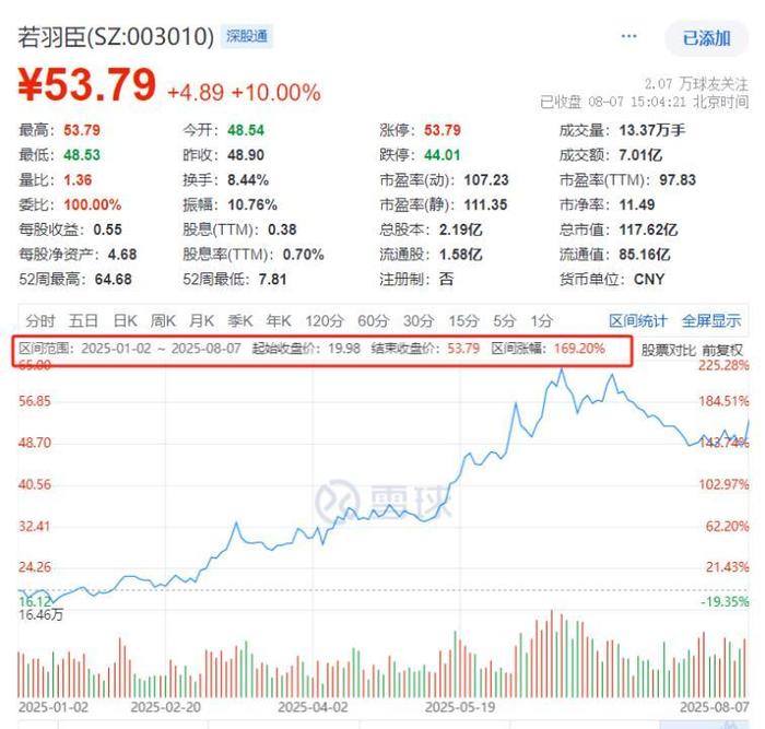 清扬君日化财经观察室的统计数据显示,截至2025年8月7日,其股价由年初的19.8元飙升至53.79元,区间涨幅达169%。然而,公司7月15日预告的全年归母净利润仅为0.63–0.78亿元,同比增速61.8%–100.3%,远不足以支撑如此陡峭的估值抬升。