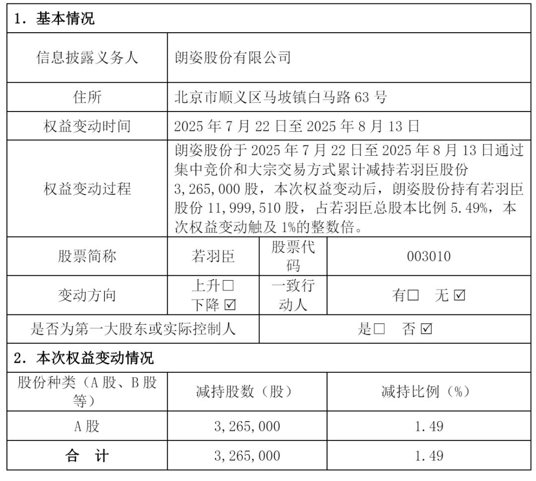 2025年8月20日,若羽臣发布公告称,近日收到朗姿股份出具的《关于广州若羽臣科技股份有限公司股份减持计划实施进展的告知函》及《简式权益变动报告书》,获悉朗姿股份于2025年8月14日通过集中竞价交易方式减持公司股份6,000股,2025年8月18日通过大宗交易方式减持若羽臣股份1,060,000股,合计减持1,066,000股,占若羽臣总股本比例0.49%。