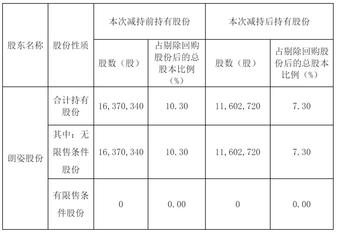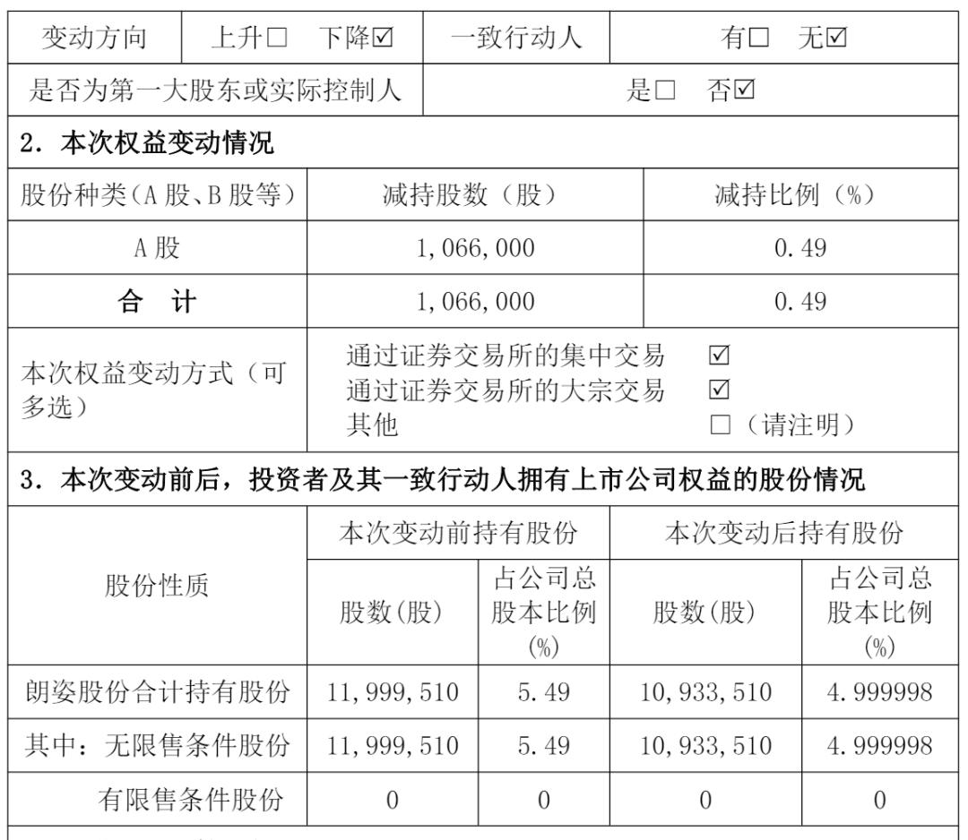 本次权益变动后,朗姿股份持有若羽臣股份数量10,933,510股,约占若羽臣总股本4.999998%,持股比例降至5%以下,不再是持股5%以上股东。