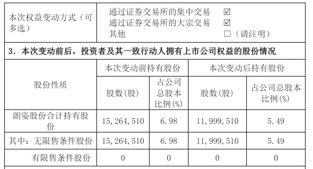 本次权益变动后,朗姿股份持有公司股份11,999,510股,占公司总股本比例5.49%。