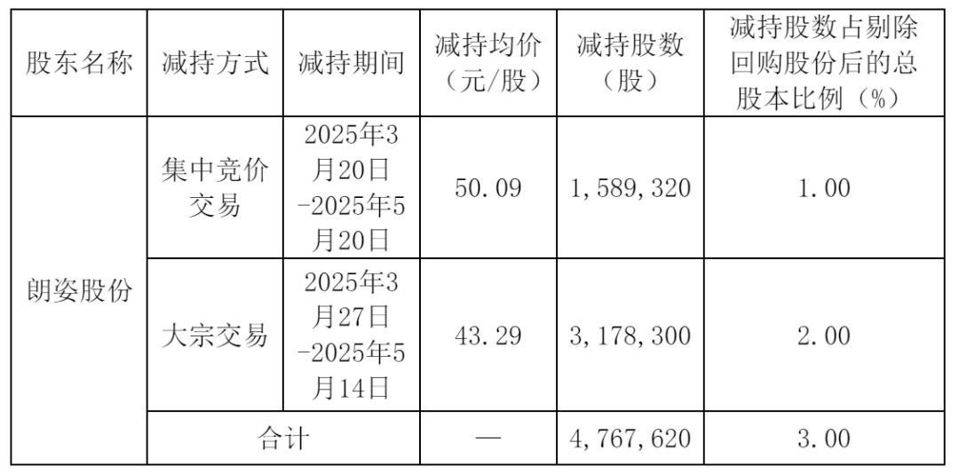 2025年5月22日,若羽臣发布公告称,朗姿股份通过集中竞价交易方式减持的股份成交价格区间为39.15元/股-64.00元/股,减持159万股,套现7964万元;通过大宗交易方式减持的股份成交价格区间为36.82元/股-46.05元/股,减持318万股,套现1.38亿元,一共套现约2亿元。