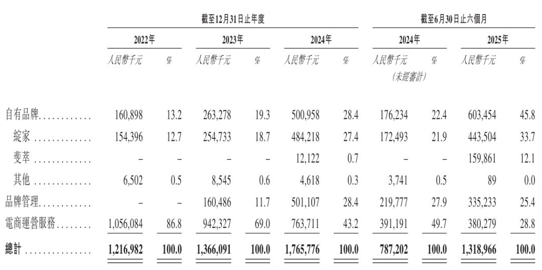 若羽臣2025年上半年来自绽家收入为4.44亿元,占比为33.7%;来自斐萃收入为1.6亿元,占比为12.1%;来自品牌管理收入为3.35亿元,占比为25.4%;来自电商运营服务收入为3.8亿元,占比为28.8%。