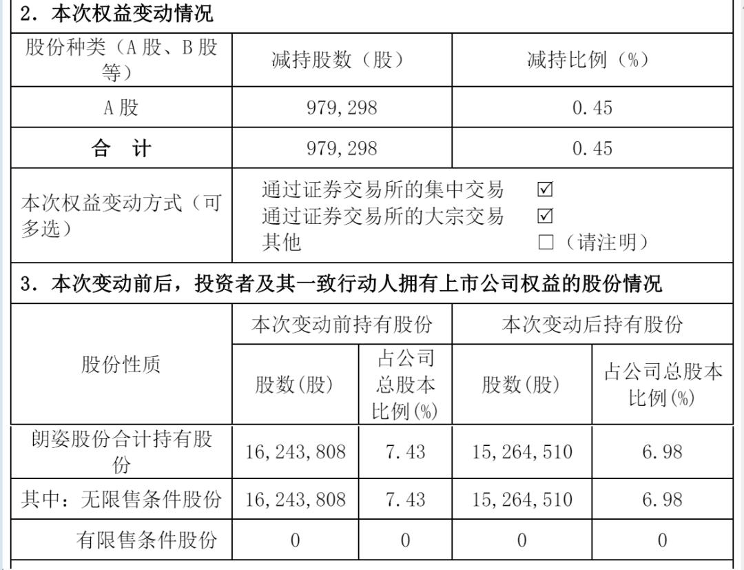若羽臣获悉朗姿股份于2025年7月1日至2025年7月17日期间通过集中竞价交易方式累计减持公司股份886,298股,通过大宗交易方式累计减持公司股份93,000股,合计减持979,298股,占公司总股本比例0.45%。