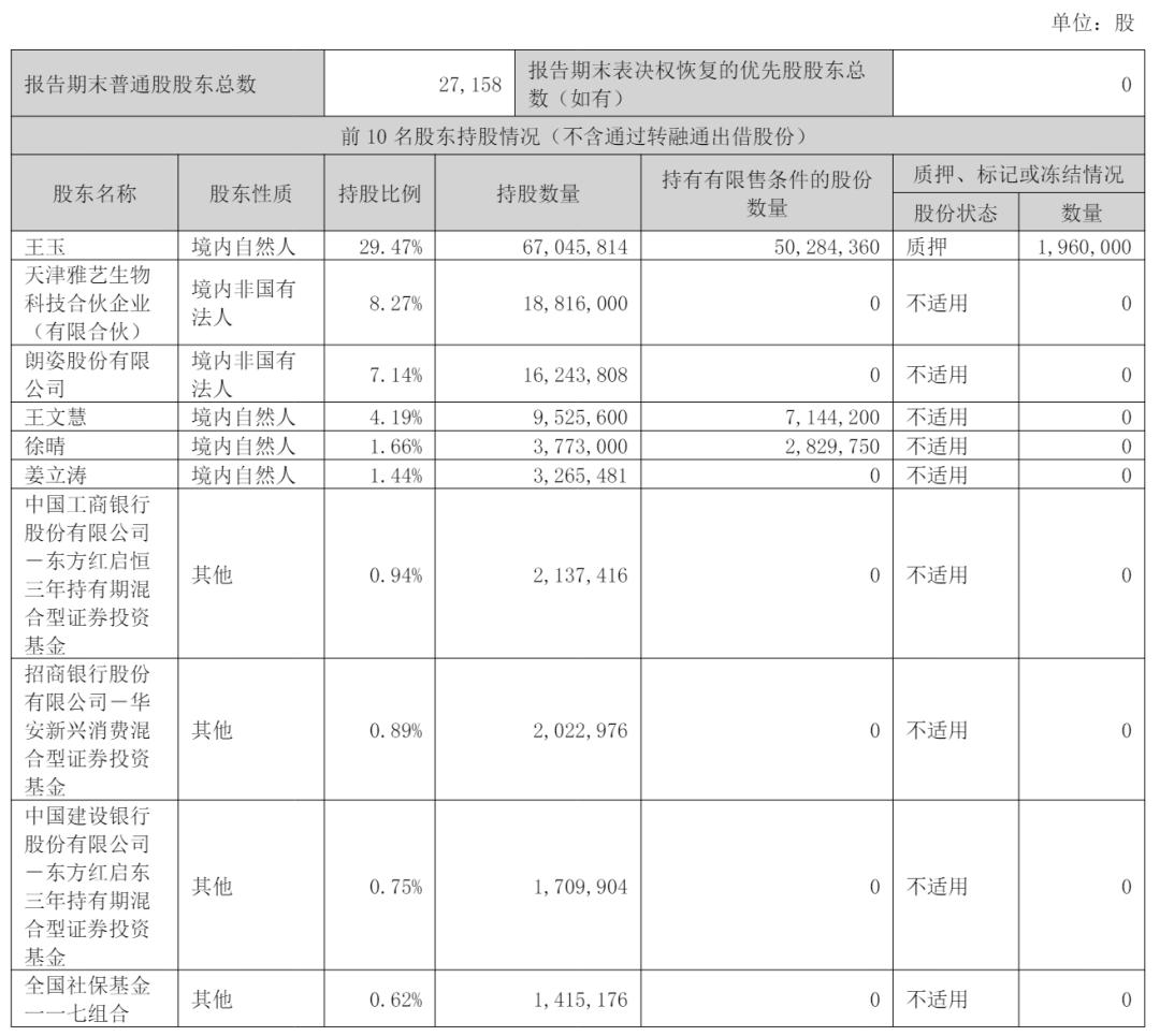 截至2025年6月30日,朗姿股份有限公司持股为7.14%,徐晴持股为1.66%,姜立涛持股为1.44%,中国工商银行股份有限公司-东方红启恒三年持有期混合型证券投资基金持股为0.94%,招商银行股份有限公司-华安新兴消费混合型证券投资基金持股为0.89%;