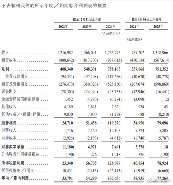 业绩来看,2022-2024年、2025H1,若羽臣营收分别为12.17亿元、13.66亿元、17.66亿元和13.19亿元;净利润分别为0.34亿元、0.54亿元、1.06亿元和0.72亿元,呈现营收、净利双增的态势。