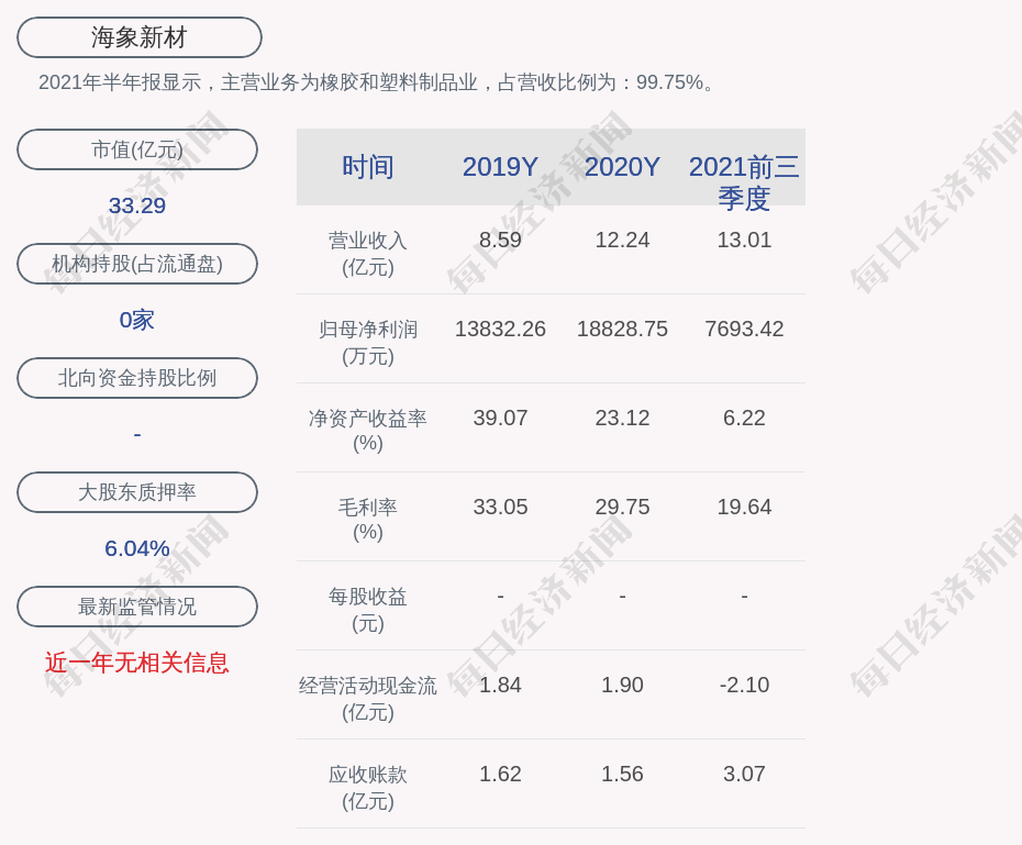 2021年半年报显示,海象新材的主营业务为橡胶和塑料制品业,占营收比例为:99.75%。