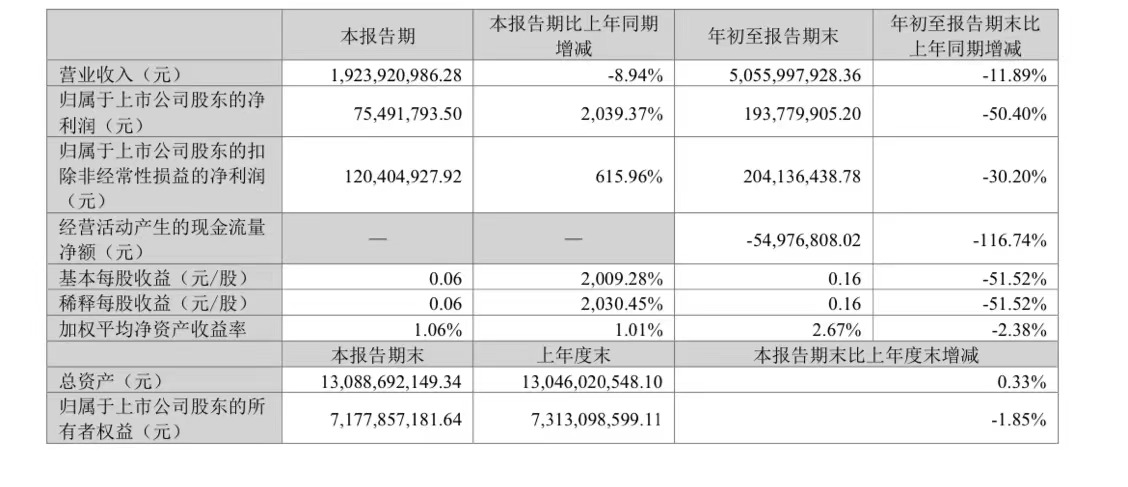 根据公告,今年前三季度,公司实现营业收入50.56亿元,同比减少11.89%;归属于上市公司股东的净利润1.94亿元,同比减少50.4%;经营活动产生的现金流量净额为-5497.68万元。