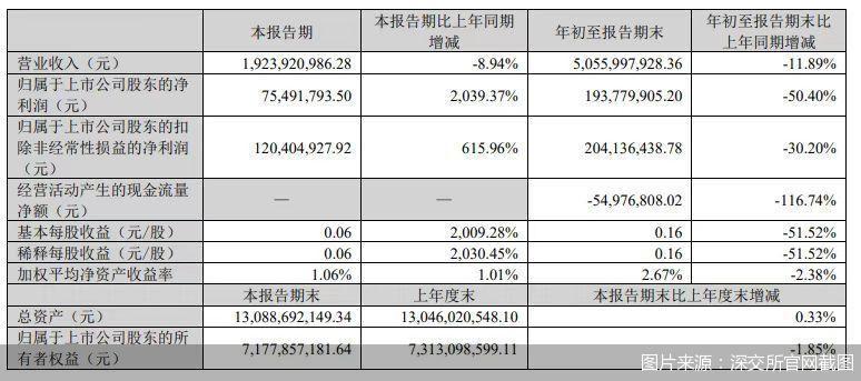东鹏控股表示,“本报告期,面对内外部挑战,公司持续改善经营质量,第三季度归属于上市公司股东的净利润与去年第三季度同比增长 2039.37%,第三季度扣非净利润1.20亿元、经营活动产生的现金流量净额1.44亿元,与去年第三季度同比分别增长1.44亿元、2.93亿元”。