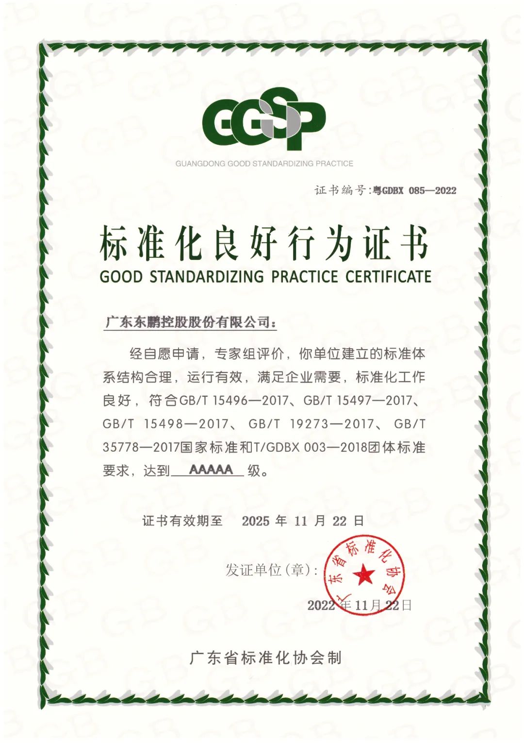 11月22日,广东省标准化协会组织专家组对广东东鹏控股股份有限公司的企业标准化工作进行评价确认,依据评价准则最终评为“标准化良好行为”AAAAA级企业。