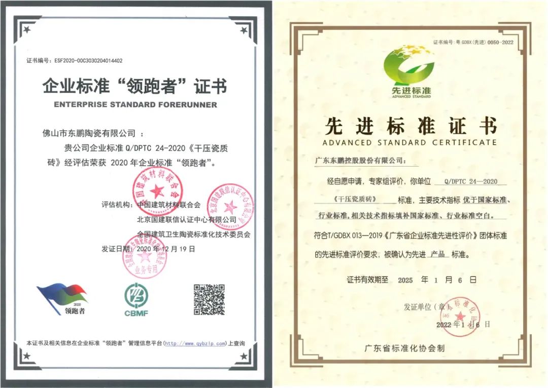 △2020年,东鹏控股作为陶瓷行业第一批入选企业标准“领跑者”,2022年东鹏控股获评为“广东省先进标准”企业