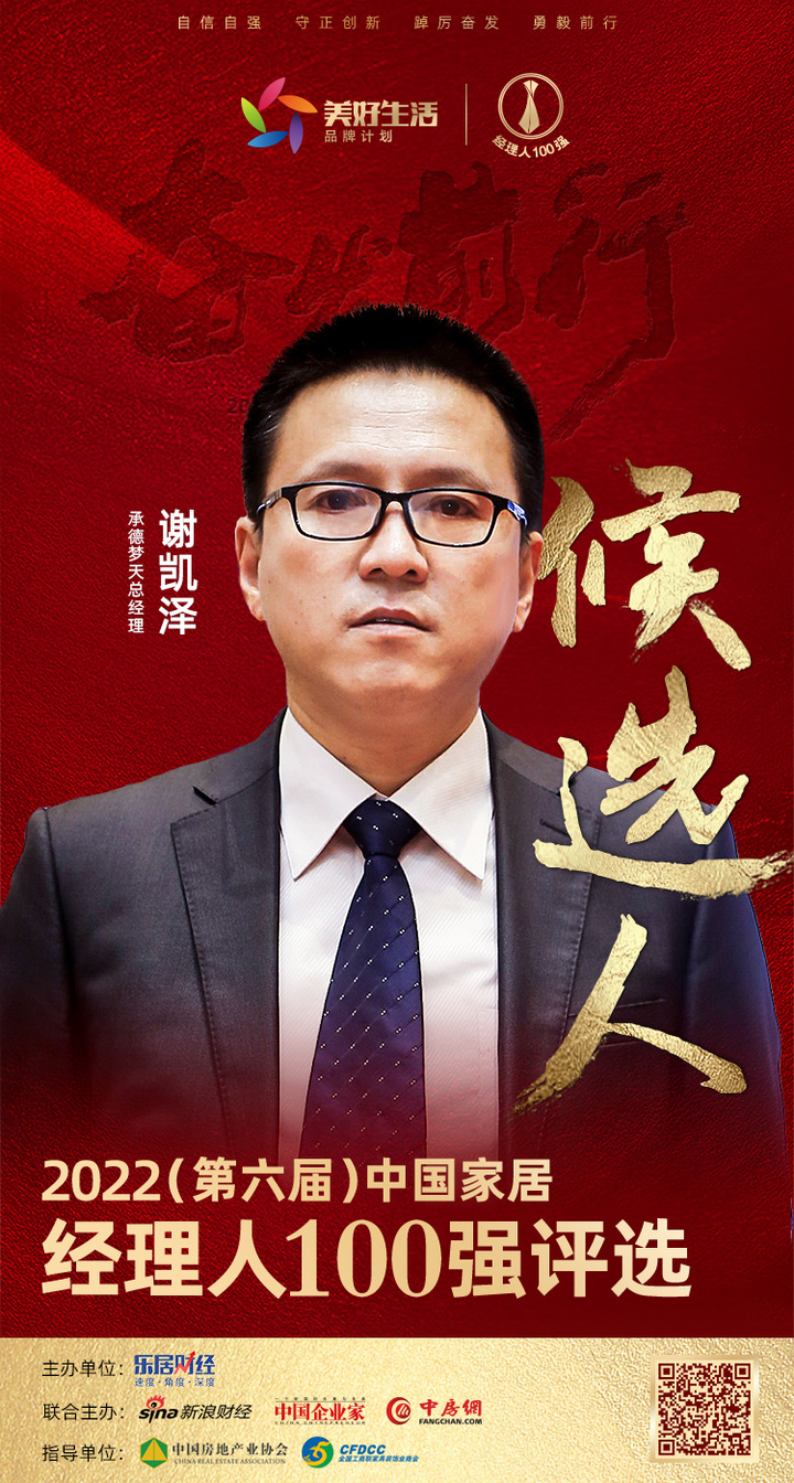 11月14日,由乐居财经主办的“奋发前行——2022(第六届)中国地产/家居/物业经理人评选”正式启动。承德梦天总经理谢凯泽获提名,成为“2022中国家居经理人100强”候选人。
