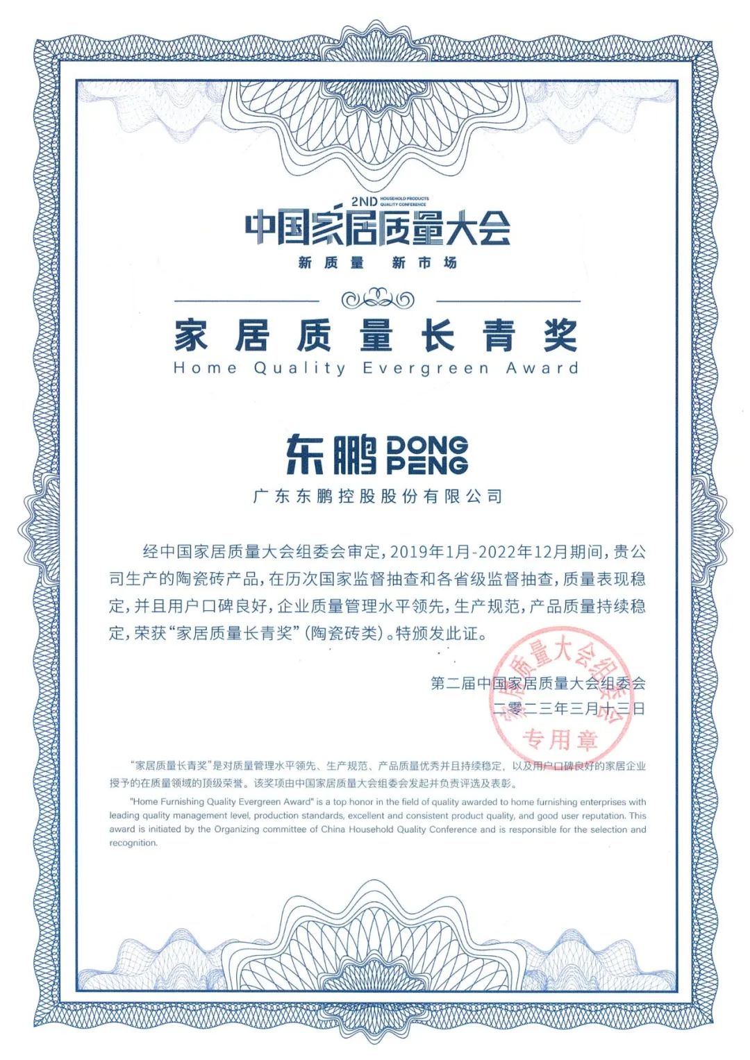 “家居质量长青奖”是对质量管理领先、生产规范、产品质量稳定,用户口碑良好的家居企业,授予的质量领域的荣誉。东鹏控股凭借卓越的质量管理、优质的产品质量等荣获最高奖项“家居质量长青奖”,作为瓷砖品类唯一获奖单位。