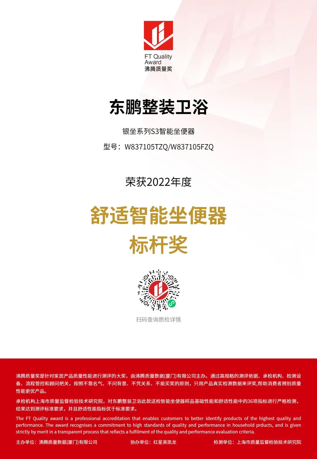 东鹏整装卫浴参评的银坐系列S4智能坐便器、银坐系列S3智能坐便器2个产品,经过承检机构对其送检样品进行严格检测,结果达到测评标准要求,并且多项性能指标优于标准要求,分别获得“沸腾质量金奖”、“舒适智能坐便器标杆奖”。
