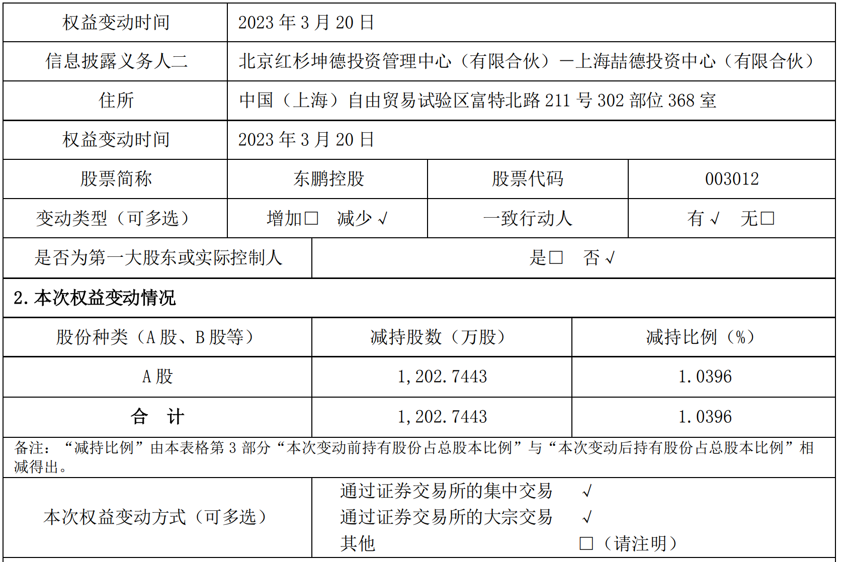 公告显示,2023年3月20日,东鹏控股董事会收到SCCHoldcoB和上海喆德出具的《关于减持东鹏控股股份进展的告知函》,自2023年2月16日权益变动公告披露以来,截至2023年3月20日,SCCHoldco B、上海喆德通过集中竞价、大宗交易方式合计减持公司股份12,027,443股,SCCHoldcoB、上海喆德合计持股比例为7.0002%(按股份总数1,173,000,000股剔除回购专用证券账户中的股份数量16,018,842股为基础计算)。至此,自权益变动公告披露以来,SCCHoldco B、上海喆德合计持股变动比例已达到公司已发行的有表决权股份比例的1%。