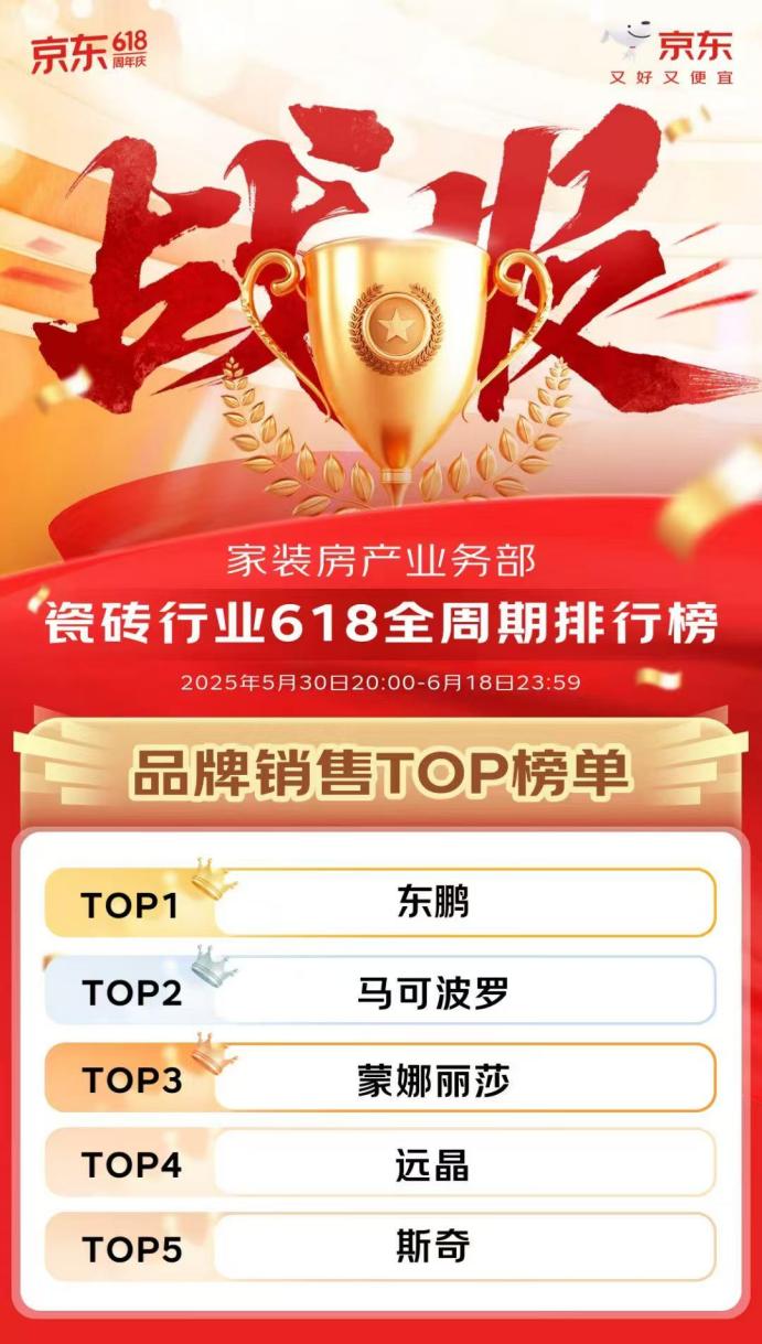 2025年“618”大促硝烟散尽,东鹏控股以服务+销量“双料冠军”之姿强势突围——不仅连续四年蝉联天猫瓷砖品类TOP1,更在今年一举包揽京东、天猫双平台四项冠军:京东“墙地面材料”、“瓷砖行业”全周期排行榜第一,天猫“瓷砖/岩板行业品牌成交榜第一”,并摘得“天猫家装全周期Top10店铺优质服务榜第一”。