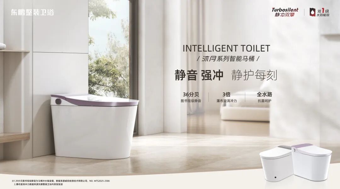 在产品层面,东鹏整装卫浴以用户需求为核心,在静音、洁净、健康、智能等关键维度实现技术突破。智能马桶采用的Turbosilent静冲双擎技术,在保持超低噪声运行的同时确保强劲冲力,实现一次冲洗彻底;构建的多重抗菌防护系统涵盖进水过滤、全水路杀菌、座圈抗菌及喷嘴紫外线杀菌等多个环节,全面守护家庭健康;集成的全域感应座圈、脚感翻盖、离座冲水等智能感应控制系统,则显著提升了使用便捷性与舒适度。