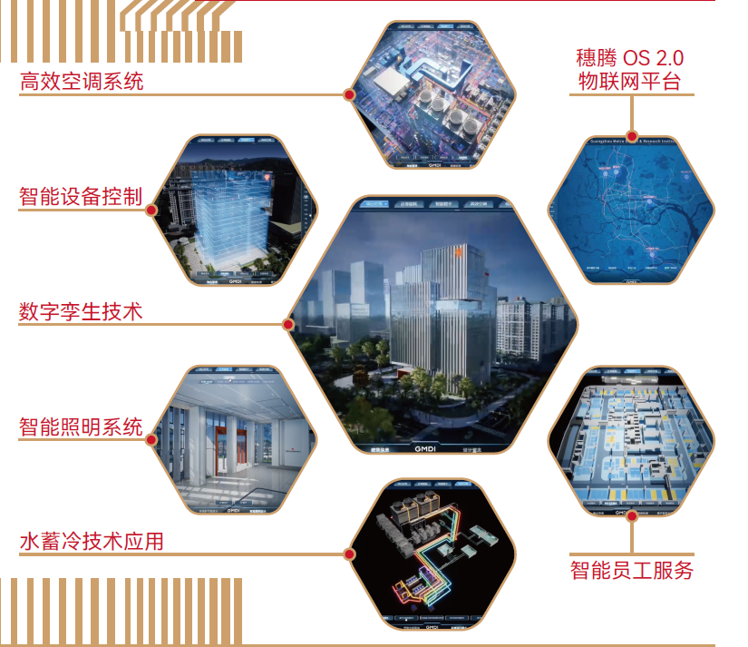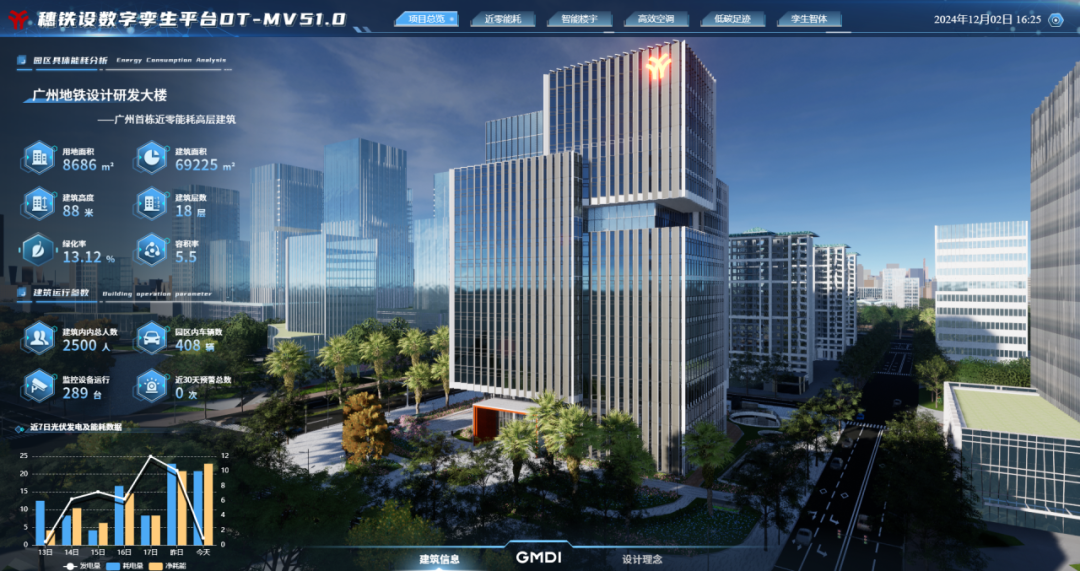 设计秉持人性化、智能化,打造数字孪生智慧运维+穗腾OS2.0物联网平台通过自主研发的数字孪生技术,搭建大楼能源管理可视化系统,整体对能耗碳排放进行动态监测,通过数据分析,调整运维策略,不断提升节能效果动态监测楼宇设备状态。