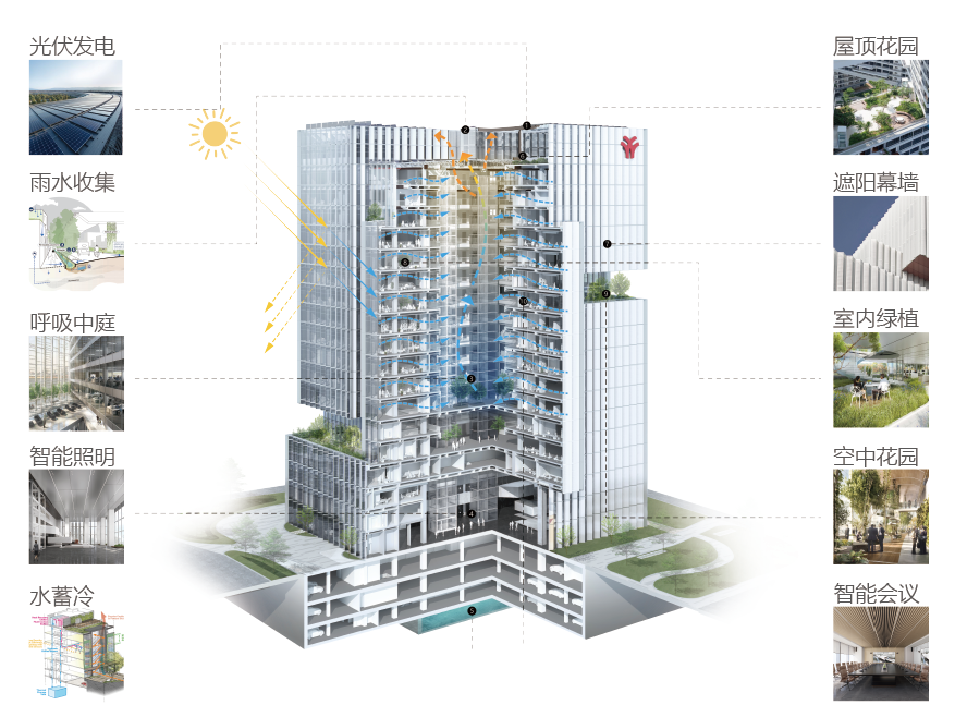 结合岭南建筑设计手法,打造会自由呼吸的建筑中庭,配合每层外窗利用热压通风实现减少空调运行时间,并通过夜间通风排走雅间建筑内的热量,实现通风换气,形成健康舒适的室内微气候。