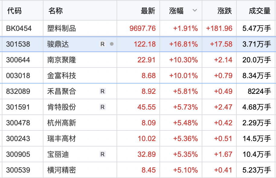 6月18日午后,塑料制品板块震荡走高。截至14时29分,金富科技涨停。骏鼎达涨超16%,南京聚隆涨逾10%,肯特股份、杭州高新等多股涨逾5%。