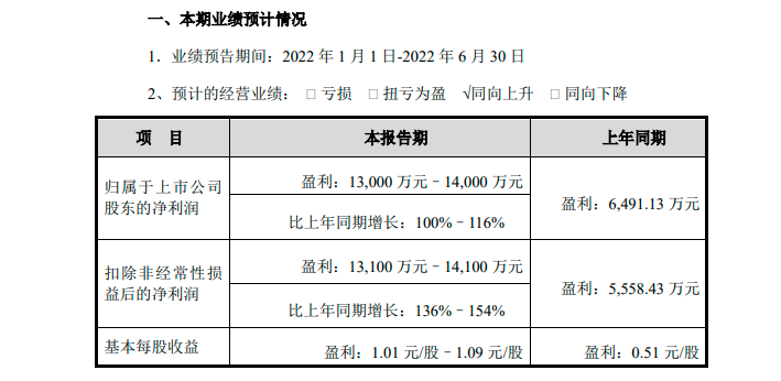 7月5日,宸展光电(SZ.003019)发布半年报业绩预告,公司预计2022年上半年业绩大幅提升,归属上市公司股东的净利润为13,000万元—14,000万元,净利润相比去年同期的6,491.13万元增长100%— 116%,预计基本每股收益为1.01元—1.09元。