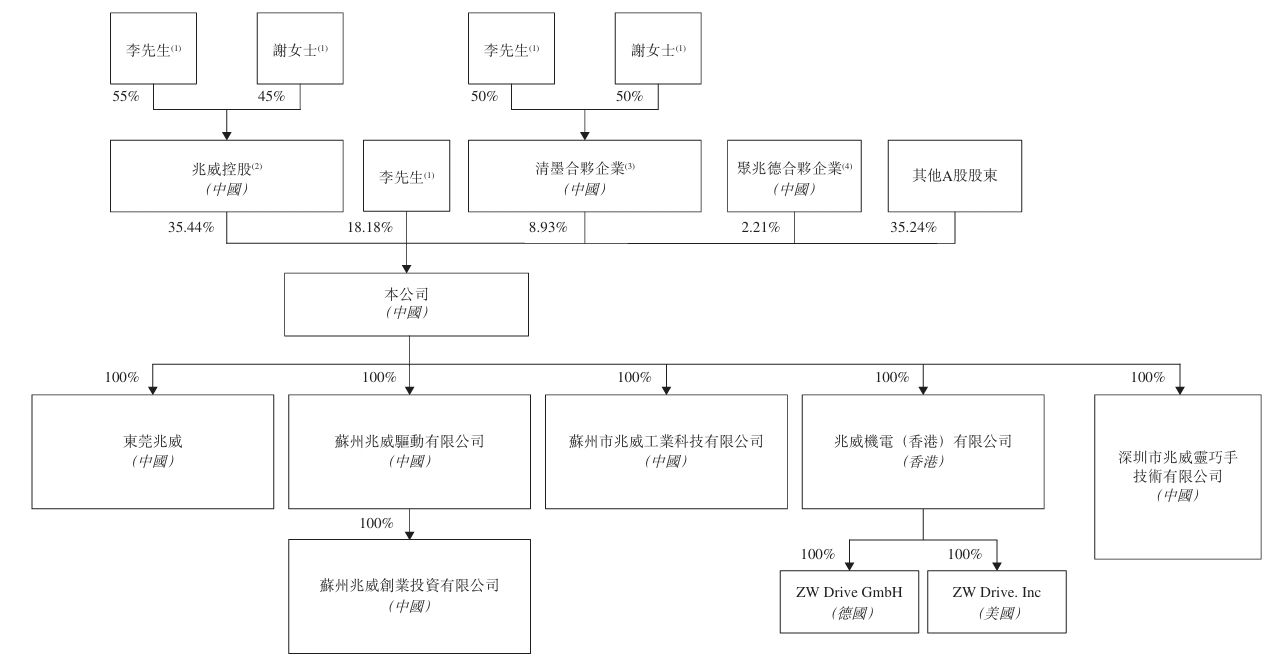 在港股上市前的股权架构中,控股股东为李海周、兆威控股、李海周的妻子谢燕玲及李海周夫妻共同持有的共青城清墨创业投资合伙企业(有限合伙),控股股东合计持有兆威机电62.54%的投票权。