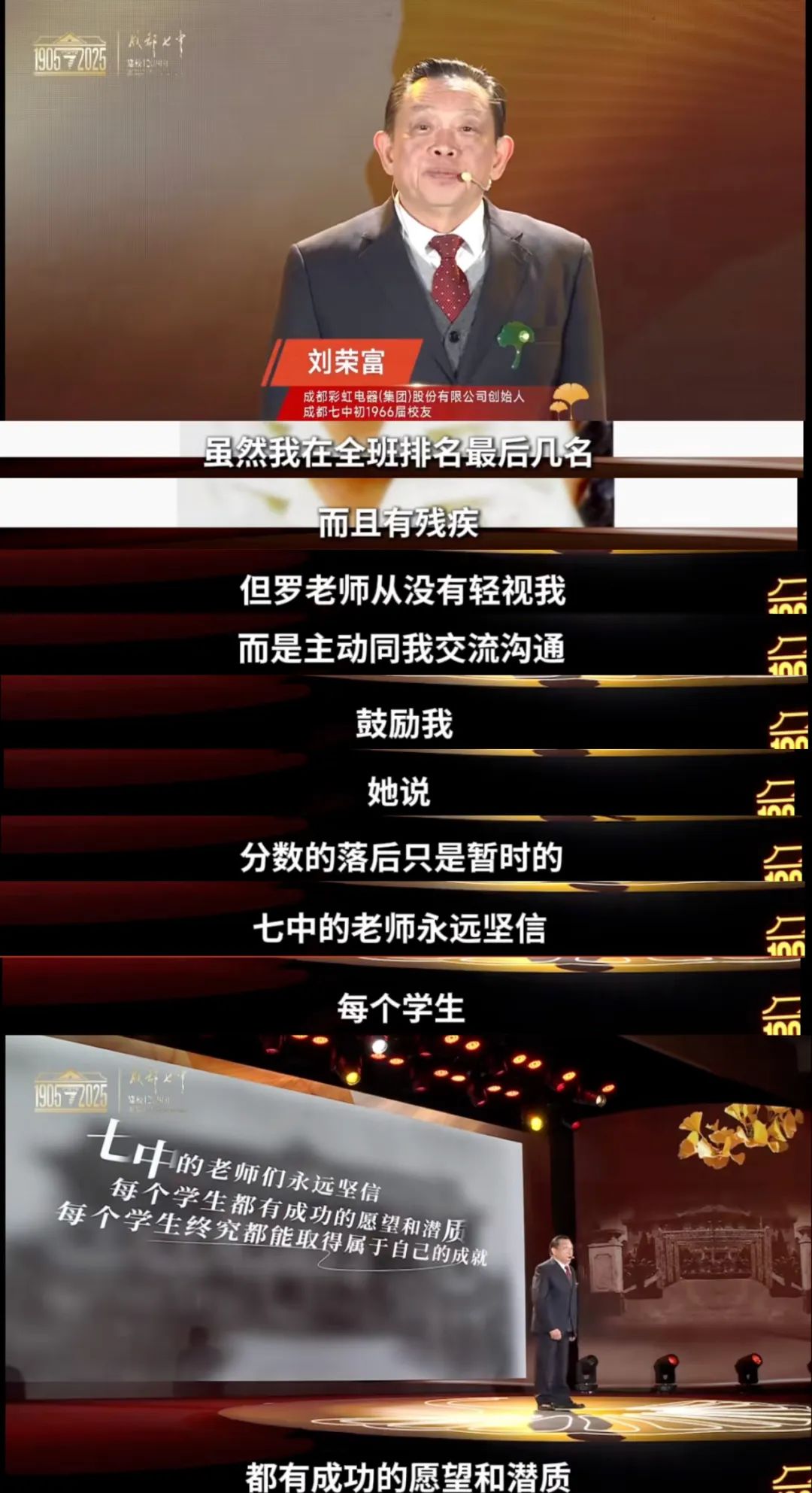 锦江碧波动,曦园披翠薇。七里香飘拂林荫街,芙蓉城春满锦城湖,成都七中百廿华诞,与春晖同至。作为成都七中初66届的学生,彩虹集团创始人刘荣富先生讲述了他与成都七中的人生故事,正因为受到了来自母校教育的影响,刘荣富也诠释了教育让善意的种子逐渐成长壮大,为更多的人遮风挡雨,也为社会贡献自己的一份力量。