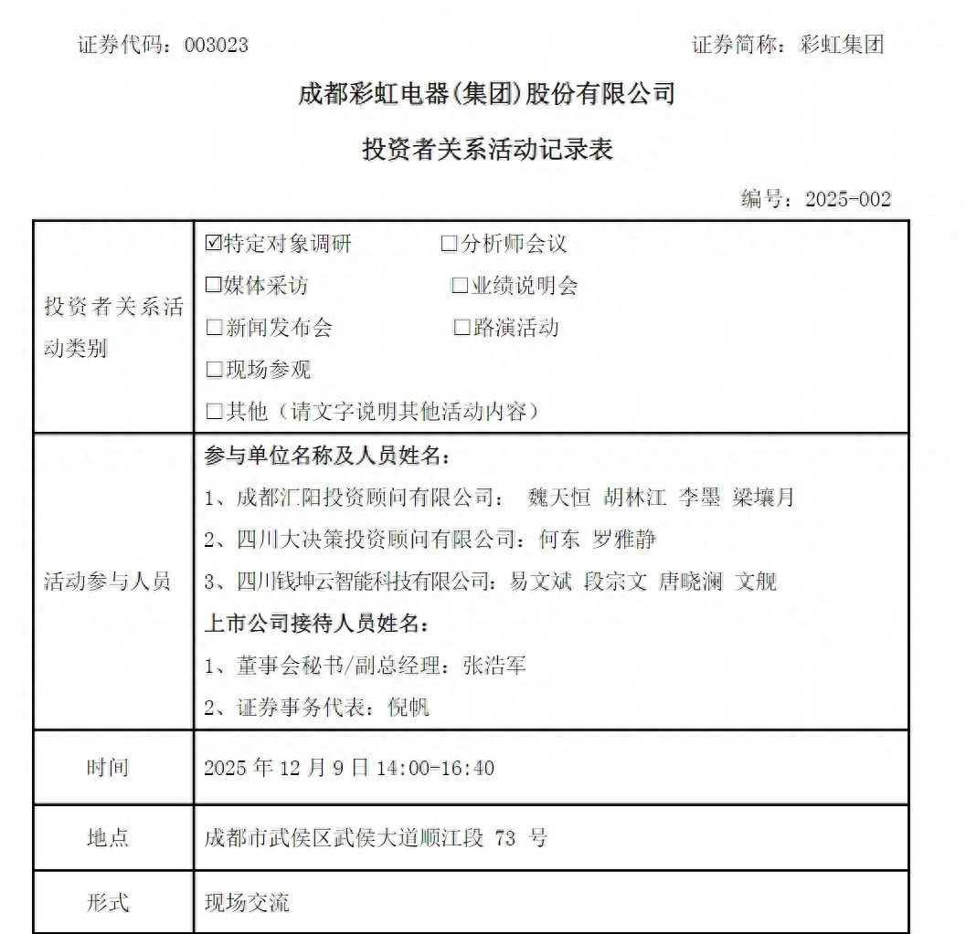 根据12月11日公司披露的投资者关系活动记录表来看,12月9日, 成都汇阳投资顾问有限公司 、四川大决策投资顾问有限公司、 四川钱坤云智能科技有限公司 和公司董秘、证代等管理人员进行了现场交流。