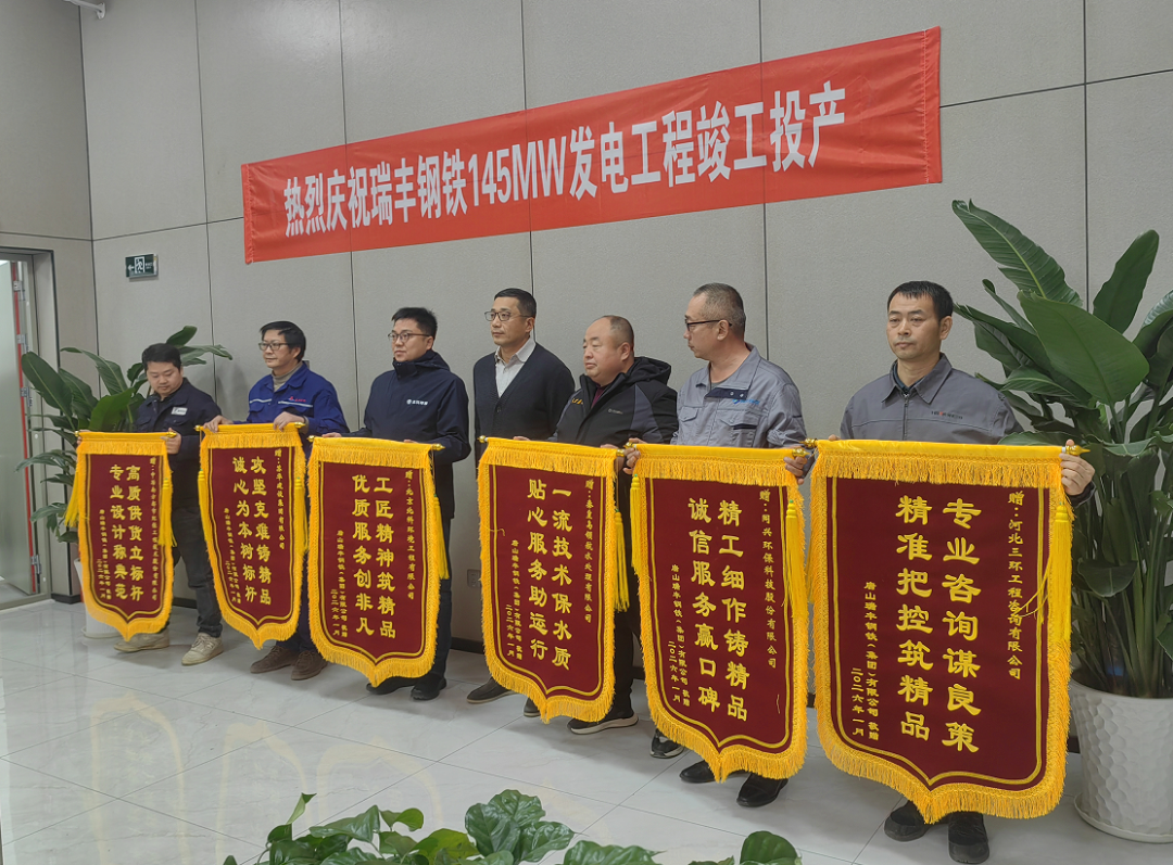 1月28日,唐山瑞丰钢铁(集团)有限公司145MW超临界煤气发电增效工程顺利投产并网。瑞丰钢铁董事长付嵩洋莅临现场祝贺,并向各参建单位代表颁发锦旗。其中,赠予同兴科技的锦旗上印有“精工细作铸精品,诚信服务赢口碑”,对我司在项目中展现的高效服务与专业精神给予高度认可与感谢。
