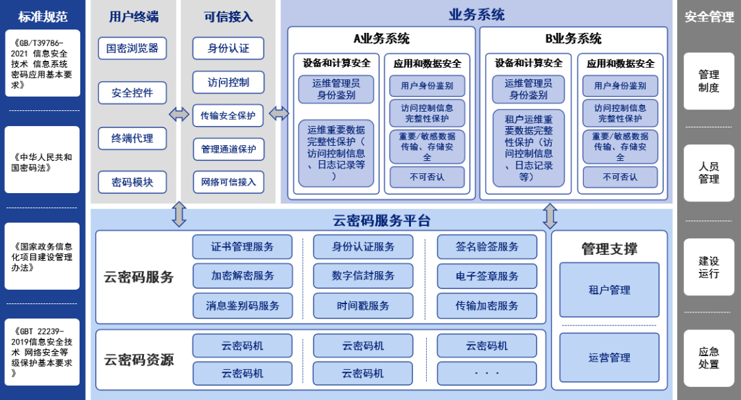 吉大正元政务云密码应用方案是以密码技术为核心,以云密码机、签名验签服务器、身份认证网关等密码产品为支撑,通过密码服务平台提供统一的安全密码服务,构建面向云上业务系统的密码安全支撑体系,实现针对物理与环境、网络和通信、设备和计算、应用和数据等多个安全层面的密码应用保护,同时建立密钥管理和安全管理制度,从制度上规避密码安全风险。