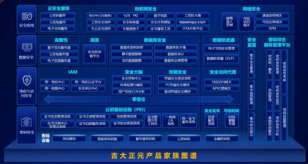 近年来,吉大正元立足优势技术不断创新,打造了以密码为核心的网络安全技术实力,积极开展密码技术、网络安全、云安全、信创安全、区块链、人工智能、量子计算等领域的前沿技术研究,不断提升产品技术竞争力和公司整体实力,这也让公司从传统单一系列优势转变为全产业链的竞争优势,不断拓展并深耕身份与信任、数据安全、物联网安全、工控安全、云安全等大安全领域,不断推出新的产品和解决方案,打造密码安全、身份与信任体系、数据安全、系统安全、网络安全、云安全、应用安全、业务安全等泛安全产品体系,并面向政府、金融、能源、电信等众多行业为用户提供从系统安全建设、应用安全建设、数据安全建设等多层次、全方位的整体解决方案和集成服务,提供关键的安全支撑与保障。