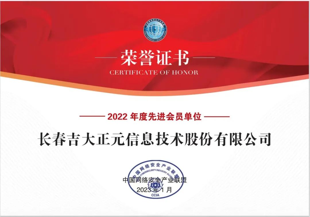 近日,中国网络安全产业联盟(CCIA)发布了关于2022年度表彰先进的决定。长春吉大正元信息技术股份有限公司(简称:吉大正元股票代码:003029)荣获“2022年度先进会员单位”。
